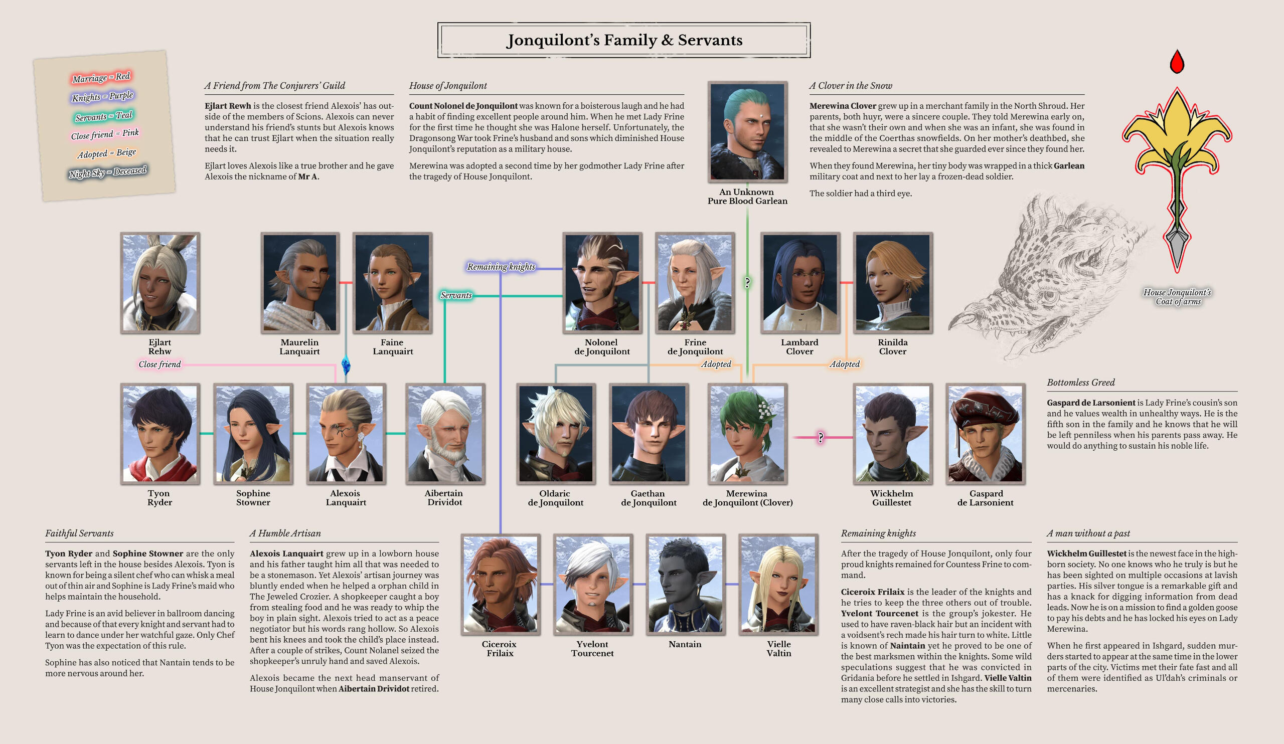 His dreams were humble and he wished only for food on the table and happiness for his family.Then he learned the ways of serving high house nobles. He swore loyalty to the Jonquilont's house and he would never break this trust.Lastly, he was given the mantle of Warrior of Light. His heart enjoys exciting adventures yet he always returns home, to Ishgard. For there is a clover he longs to see.